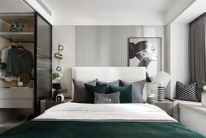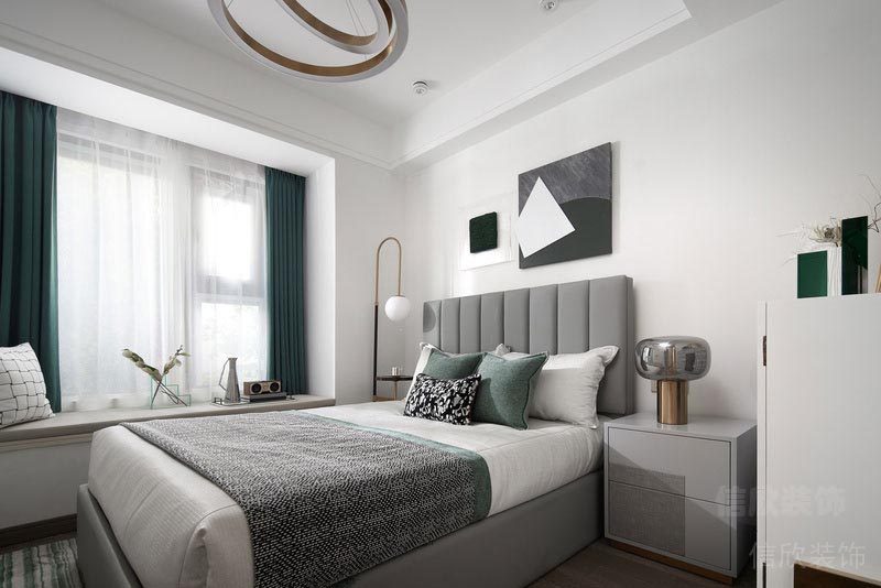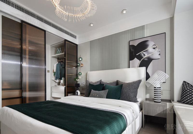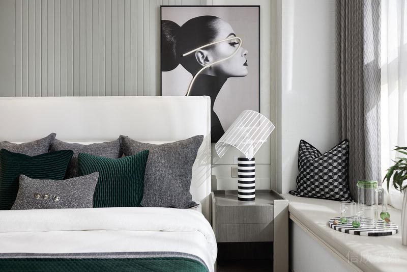 臥室的設(shè)計(jì)延續(xù)客餐廳的舒適與品質(zhì)感,摒棄一切繁復(fù)冗雜的擺設(shè),用簡(jiǎn)潔明了的語言展現(xiàn)出生活的質(zhì)感,錯(cuò)落有致的陳設(shè)細(xì)節(jié)與個(gè)性的掛畫使整個(gè)房間有一份冷靜和內(nèi)斂,打造了一個(gè)年輕時(shí)尚的都會(huì)空間。