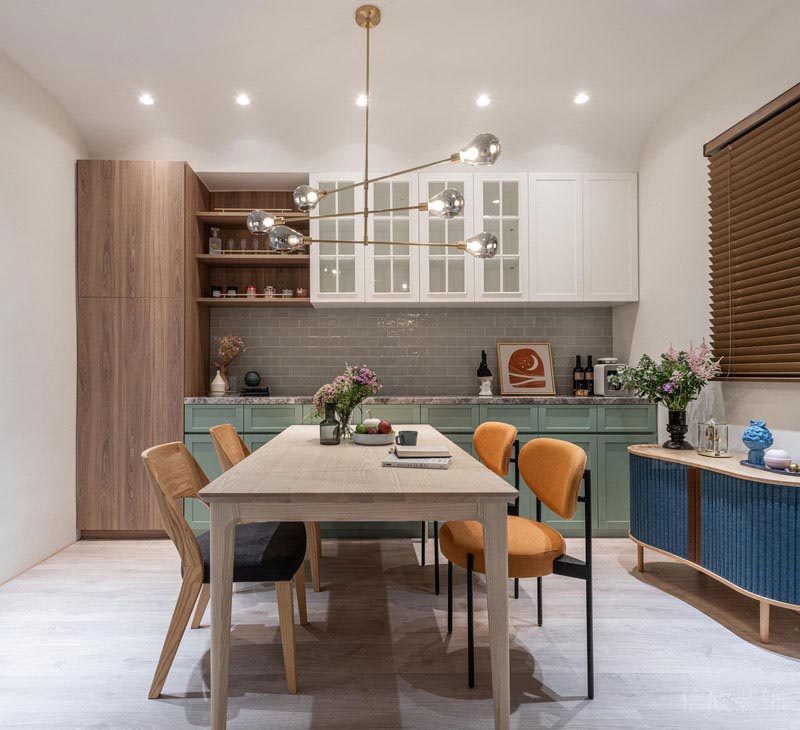 開放式的廚房,簡單實用,更讓空間感強烈,顯得寬敞而明亮;北歐式的原生木藝術桌椅,盡顯一派溫馨的氣氛。