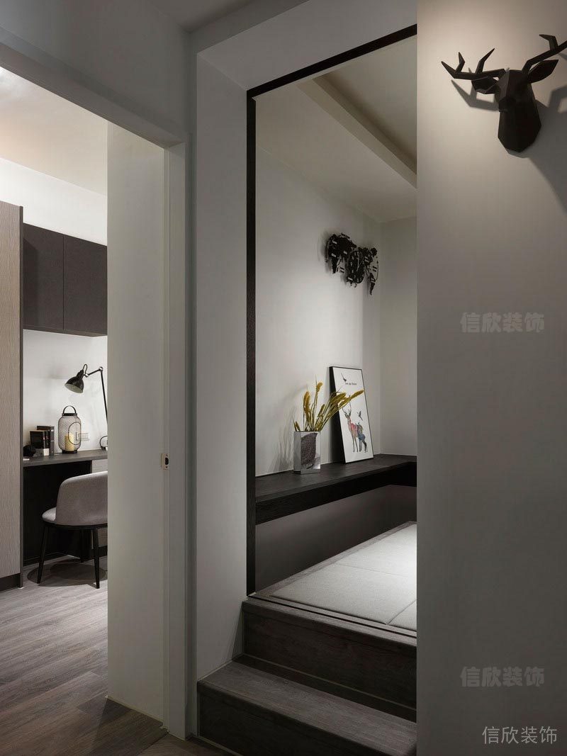 后現(xiàn)代風(fēng)黑白灰的設(shè)計(jì),不拘泥于細(xì)節(jié)和華麗的裝飾,簡(jiǎn)潔高雅的黑色吊頂,灰黑的墻地;永不停歇的是對(duì)于精神世界的探索和高尚情操的修養(yǎng)。