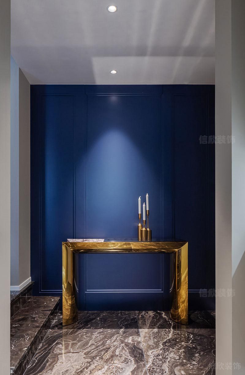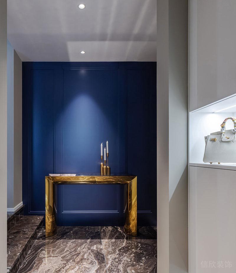 本案的玄關(guān),選用杏色的壁紙作為墻面的基調(diào),配上歐美貴族式的藍(lán)色在背景墻色調(diào),金色金屬和天然石材的玄關(guān)柜把奢華感拉到了極致。