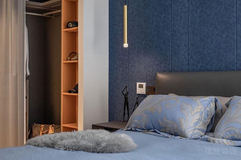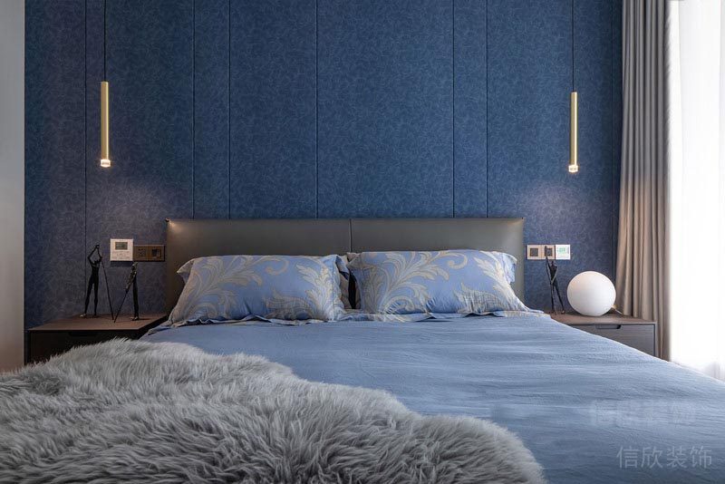 主臥室的設(shè)計(jì)采用了皮藝的床,和藍(lán)色斑點(diǎn)的硬包背景墻,配上代表輕奢風(fēng)的金屬長管式吊燈,協(xié)調(diào),溫馨中多了一份與眾不同的氣質(zhì)。