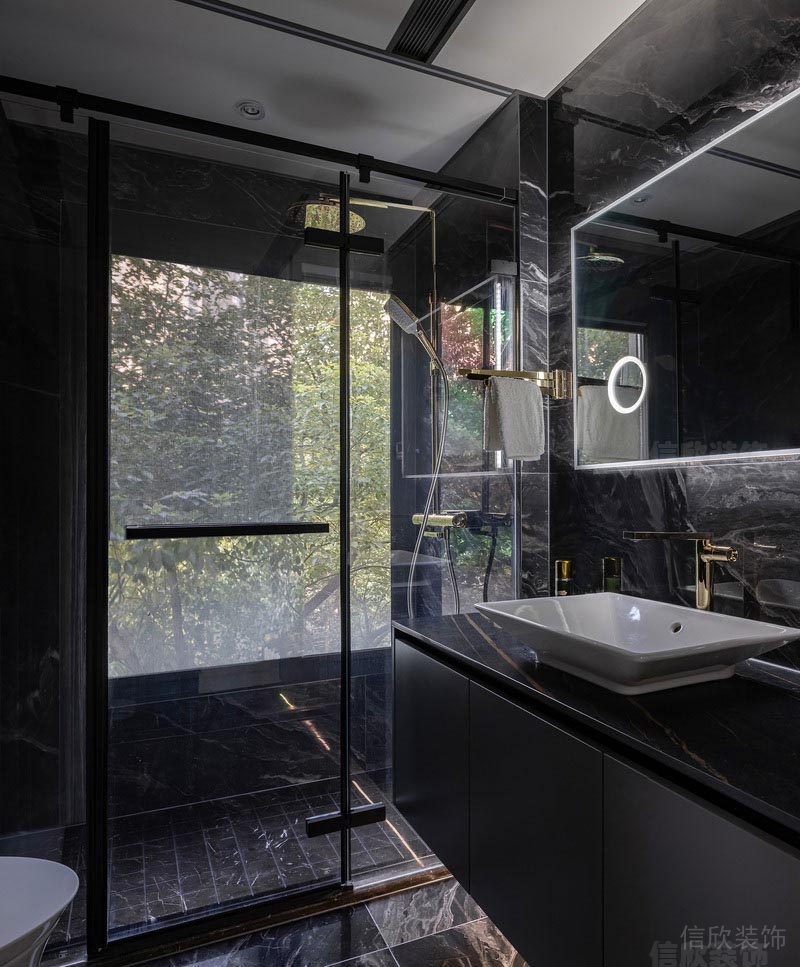 黑色紋理的墻地磚,同樣黑色的浴室柜,加玻璃做了干濕分離的衛(wèi)生間設(shè)計(jì),在功能性的區(qū)分上達(dá)到了合理方便的原則,深色的大面積的應(yīng)用則體現(xiàn)出獨(dú)特霸氣的歐式輕奢風(fēng)特點(diǎn)。