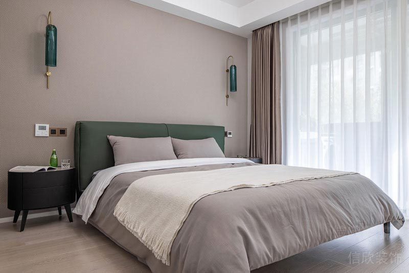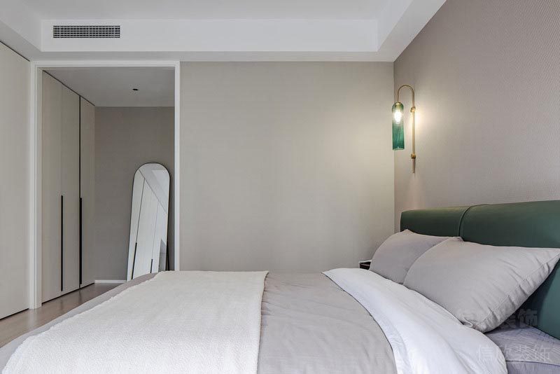 次臥室采用了一體式的白色衣柜和灰色寫字桌混搭,簡單的淺灰壁紙和米色的床頭背景墻壁紙相區(qū)分,適合的布藝床,體現(xiàn)出現(xiàn)代簡約風(fēng)中,簡單,低調(diào),實(shí)用性極強(qiáng)的特點(diǎn)。