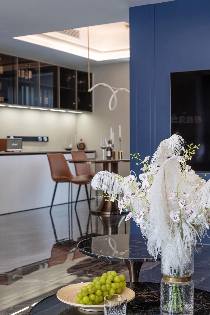 客廳藍(lán)色的背景墻,三角形帶量的吊頂,深咖色石紋地磚,專屬于貴族氣質(zhì)的天鵝絨布藝沙發(fā);無一不散發(fā)出瀟灑又桀驁的歐洲古典貴族氣質(zhì)。