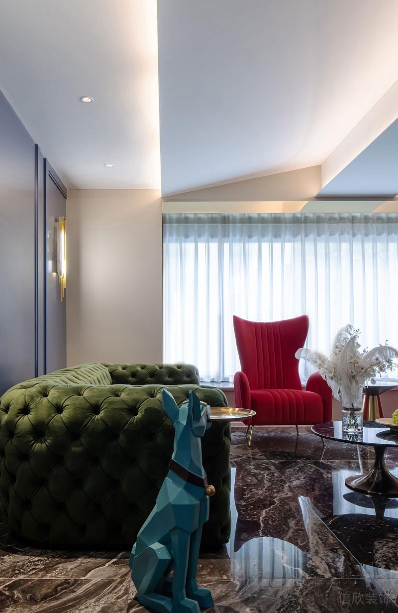 綠色沙發(fā)代表著希望,紅色的沙發(fā)椅則代表熱情,紅綠搭配的組合;讓人心曠神怡,背景墻藍(lán)色的高貴,金色壁燈的貴氣,烘托出整個(gè)客廳的浪漫氛圍。