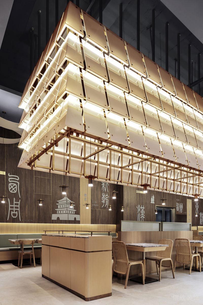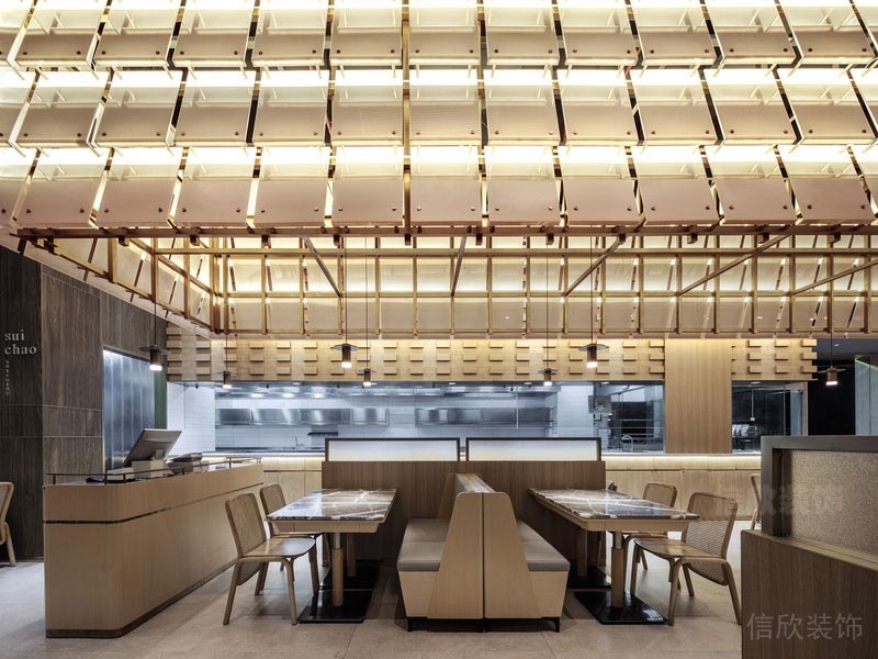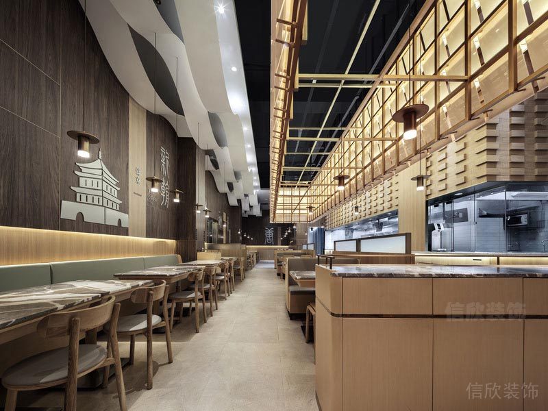 明檔上方采用城墻的方磚排列,配以凹凸木飾面代替沉重的灰色磚墻,提升了空間的質(zhì)感和視覺舒適性。