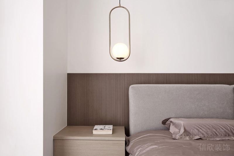 壁紙和木紋結合的背景墻,干凈,清爽的床單,現代感十足的吊燈,色調冷而溫馨,家飾簡而時尚。