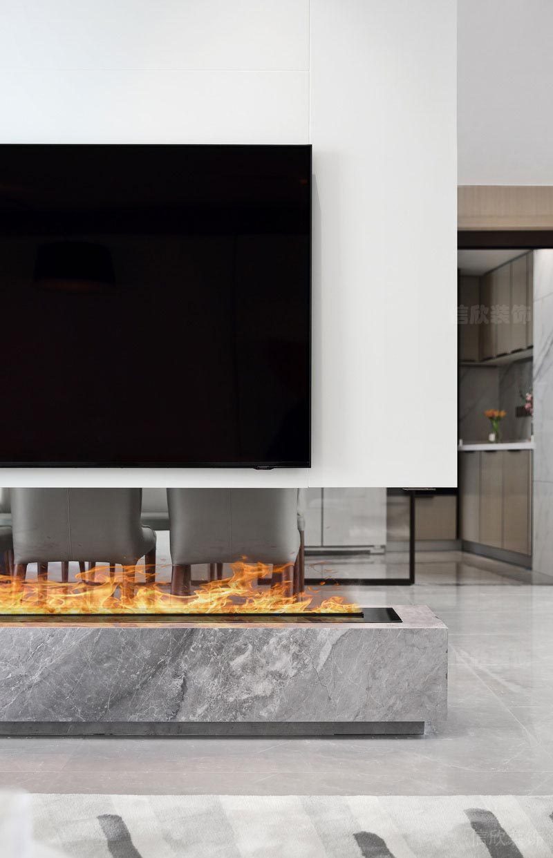 隔墻式的電視背景墻,灰色的石臺,白色的基體,熊熊燃燒的壁爐,勾勒出一副北歐式的浪漫畫卷。
