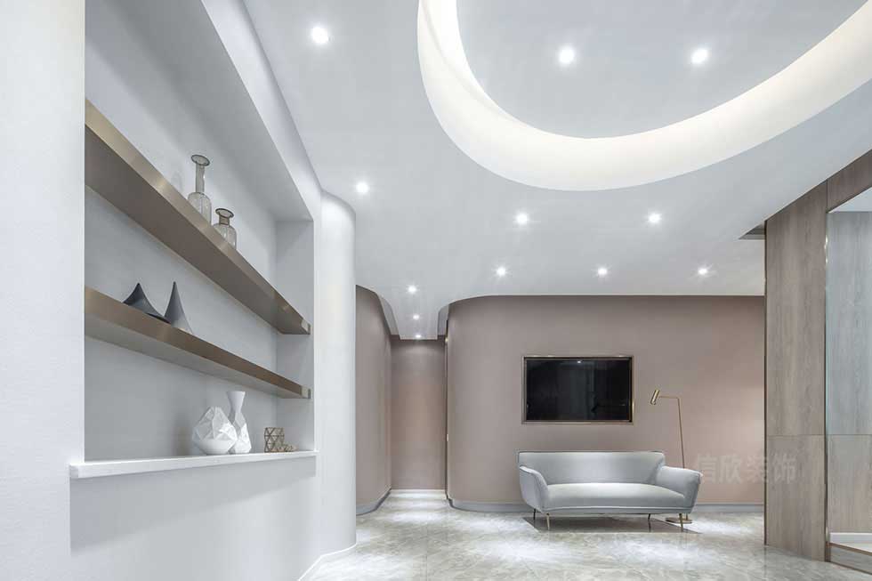 二樓大廳整體空間,我們營造了一種居家放松舒適的空間環境。采用木飾面裝飾,賦予空間一絲溫度。天花板的圓形吊頂,寓意著圓潤和諧