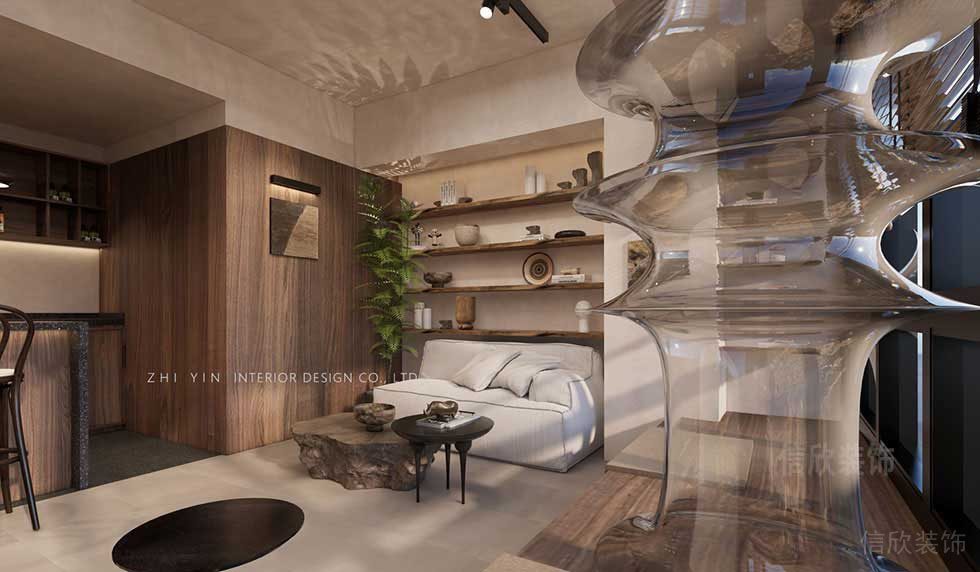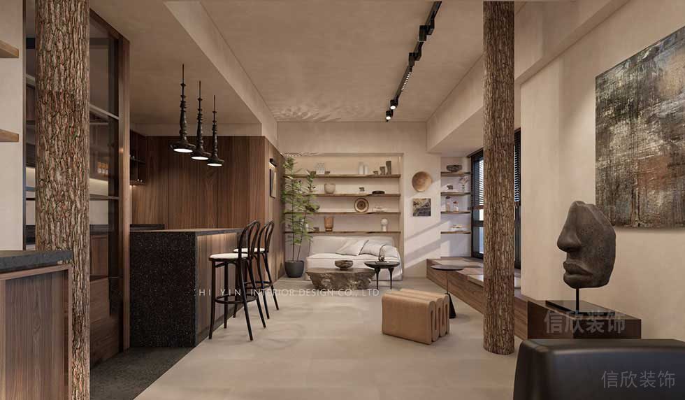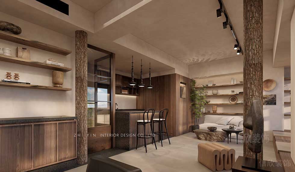 大廳裝修設計,功能分區方式并明顯,整體采用原木風格的設計理念,以極簡的手法,昏黃的顏色,表達出對于傳統的自然的美的理解,可作為一個網紅的打卡景點。