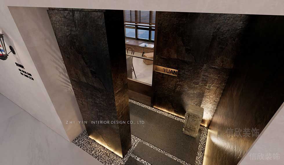 商業樓內的過道以淺色調為主,比較單調。設計團隊認為新的場地不應以面積取勝,而是要足夠獨特門頭入口以退為進,采用深色調性,瞬間形成印象。