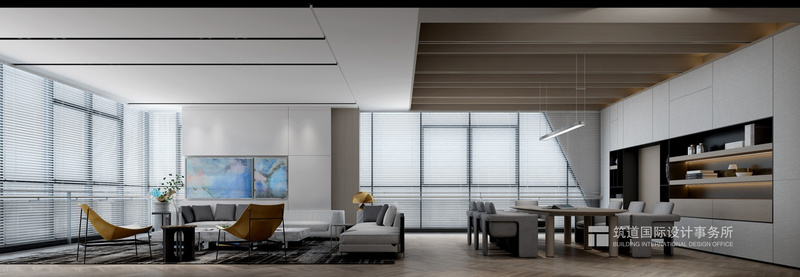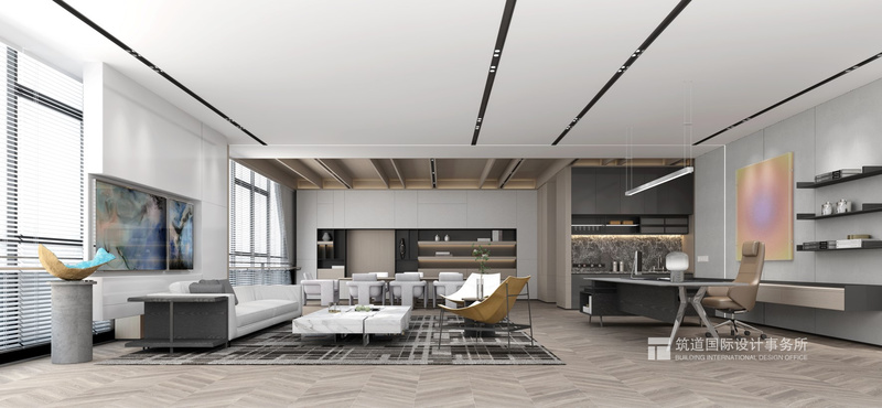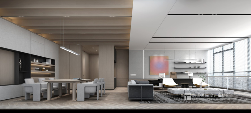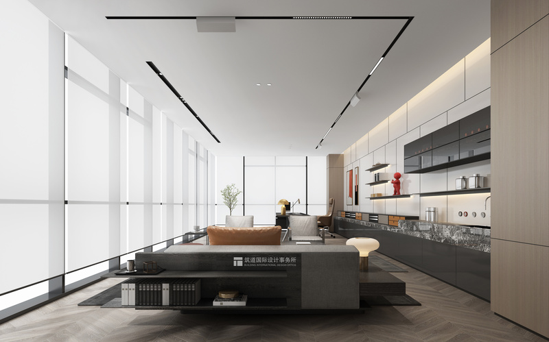 二層丨董事長辦公區 董事長辦公室,相對與客區更強調獨立性,透明落地窗搭配白色窗簾,私密之余留有空氣感。滿足多種商務洽談場景和需求。
