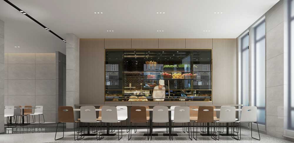 一層 | 食堂用餐區 餐廳區域運用多元化結構,樸素的色彩,簡約的家具,流暢的線條讓設計更簡潔、純粹。