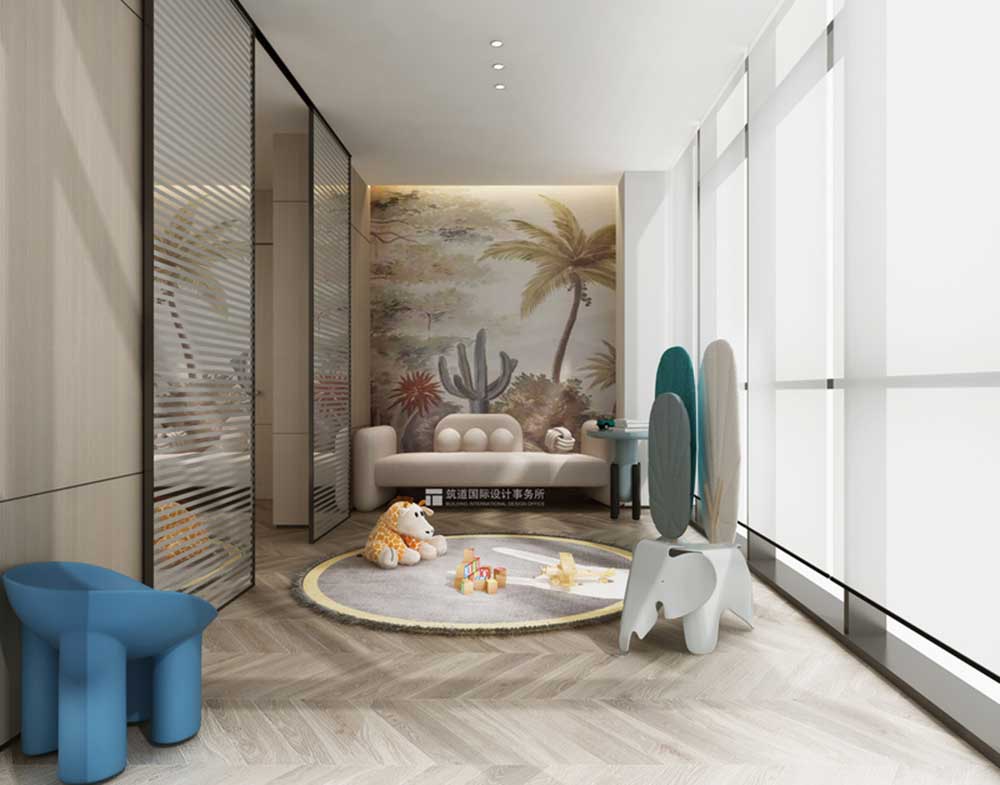 二層 | 兒童娛樂區 兒童休息區以輕奢風格為主,添加玩具等裝飾,更加活力。 為什么設計兒童娛樂區?——前面也有提到業主是一個90后海歸,有一個孩子,因此考慮到孩子的問題,就設計了一個關于兒童的區域,辦公的同時也可以兼顧。