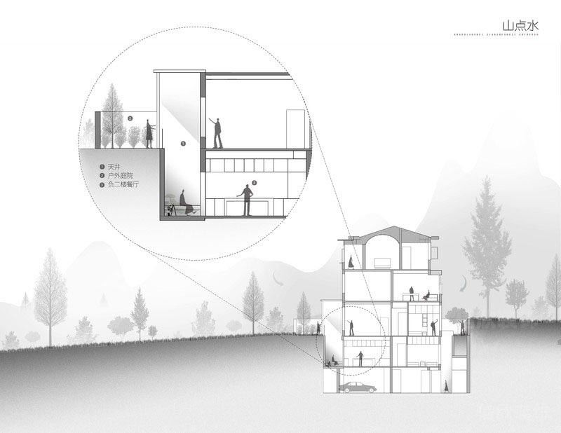 為了解決潮濕封閉環境 打開天井,設計下沉花園,景色引入屋中 打破室內外的界限,盡可能留給自然呼吸的空間