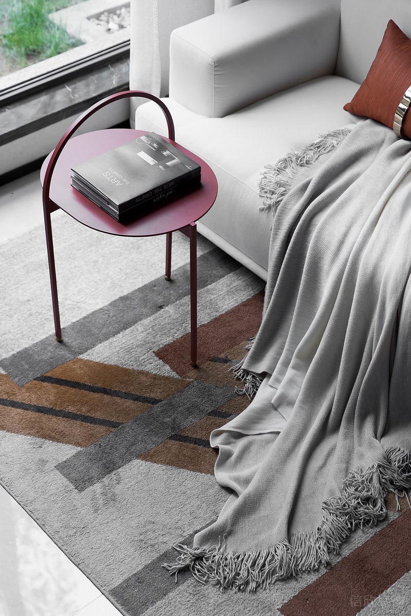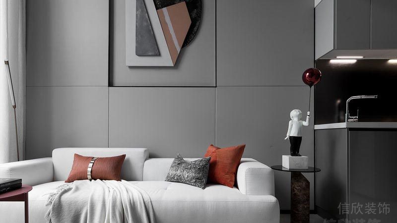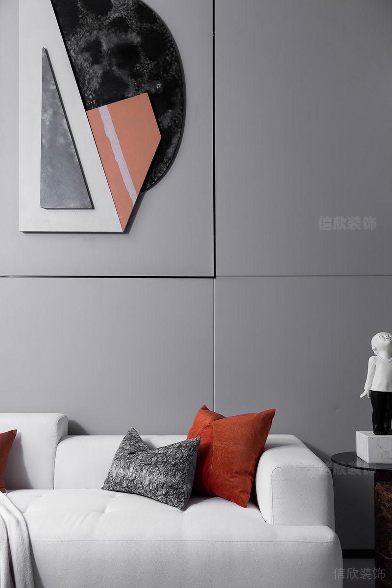 深圳市福田區景田天健天驕北廬沙發背景墻 灰色的硬包,淺灰的地面,白色的沙發,表現出后現代簡約輕快而不繁雜的生活方式,一副抽象的背景掛畫,點綴小眾化的審美情趣。
