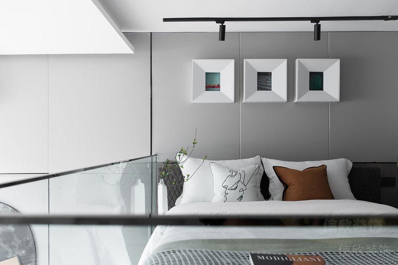 深圳市福田區景田天健天驕北廬主臥 略做造型的白色頂面,灰色的墻面,素雅而清新脫俗,配合黑色的玻璃衣柜,隨意擺放而有規律的飾品,慵懶中透出文藝的氣息。