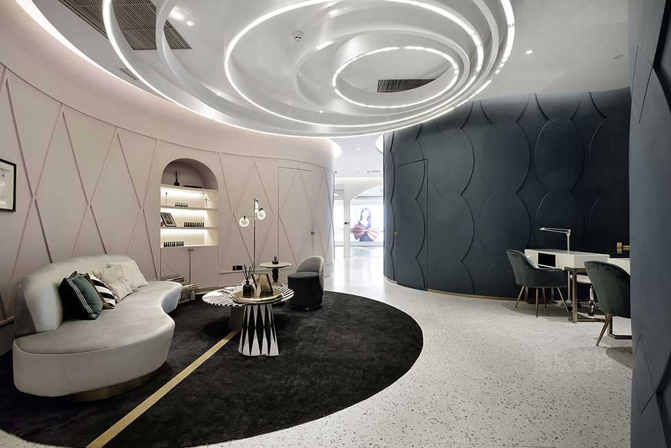大體的裝修設計,以圓形的造型為基礎,通過代表輕奢的深綠和粉色兩種顏色對比,墻面不同的紋理,以及頂面的半圓弧線條感燈膜的頂面,看上去設計新穎,理念獨特具有格調感。
