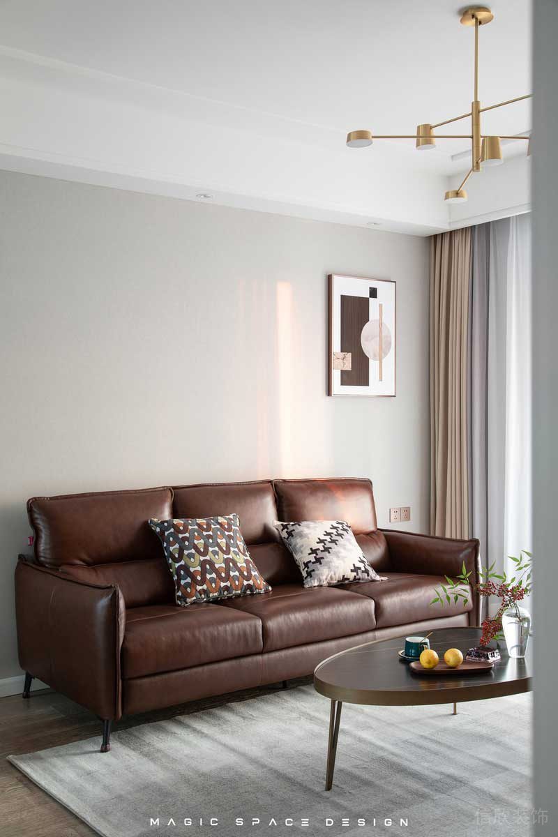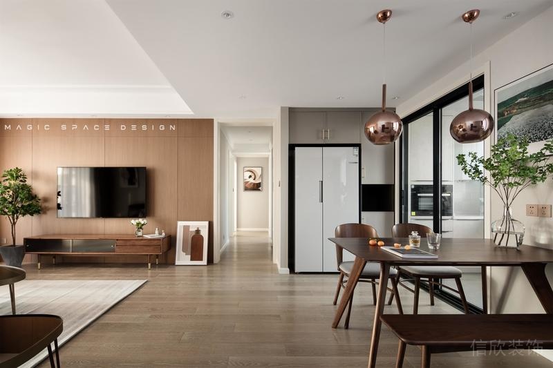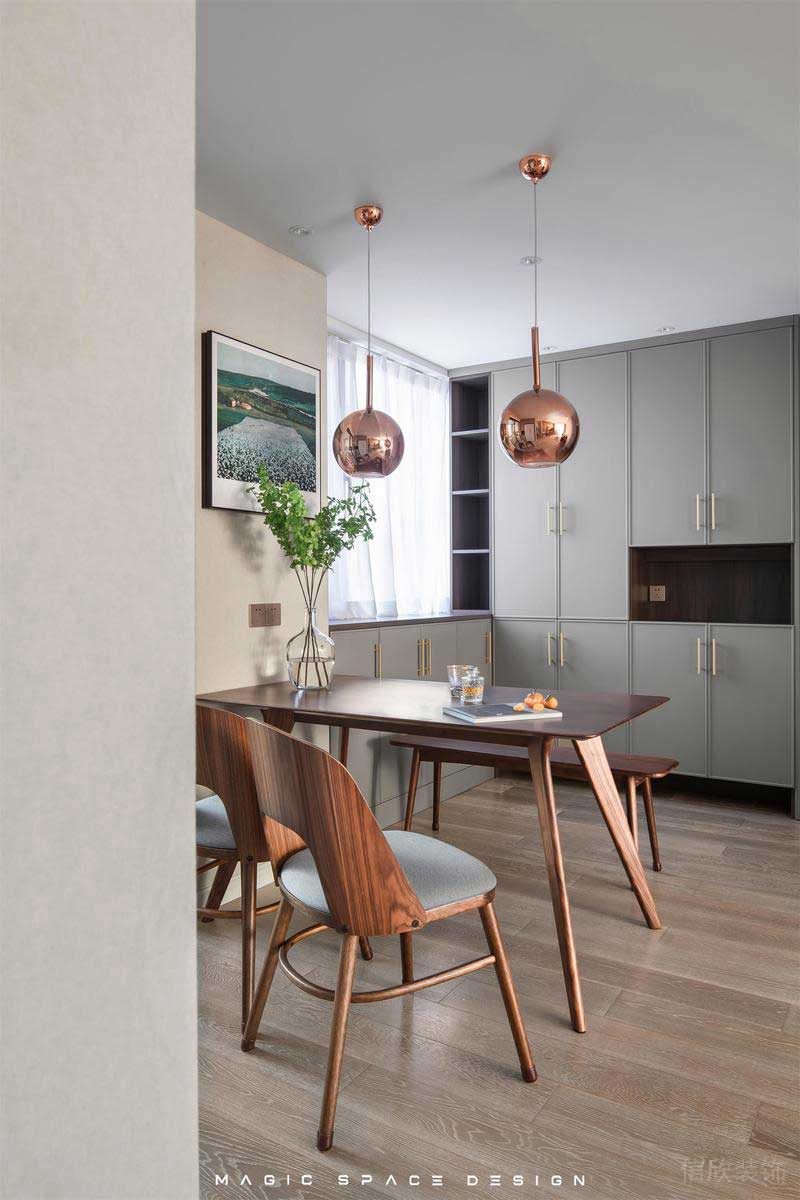 ?深圳龍崗布吉北歐簡(jiǎn)約風(fēng)舊房翻新改造裝修,設(shè)計(jì)師有意強(qiáng)化區(qū)域的結(jié)構(gòu)和色彩,通過(guò)一組金屬色的吊燈恰到好處的將虛實(shí)關(guān)系勾勒出來(lái)。