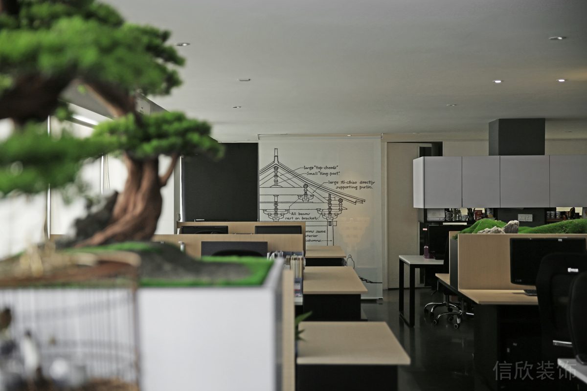 結合現代設計與傳統中式元素,木飾面和中式風格的家具,營造出一個寧靜、舒適的工作環境。增加多功能收納墻柜來提高空間的實用性。