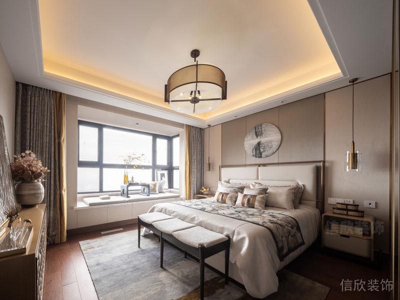 典雅的硬包背景墻,中式韻味的山水畫裝飾,現代的素色皮藝暖床,時尚貴氣的吊燈;讓您在睡夢中也能感受到濃烈的中華五千年文化所帶來的厚重沉淀感。