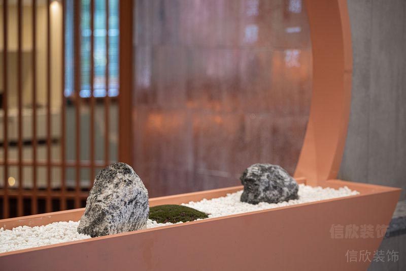 深圳市龍崗區中餐廳景觀 墻面上開了圓孔的隔墻,暗合天圓地方之意,開闊了視野,可以把陽光引進來,枯山水的綠植用餐之余,也是一道養眼的綠意。