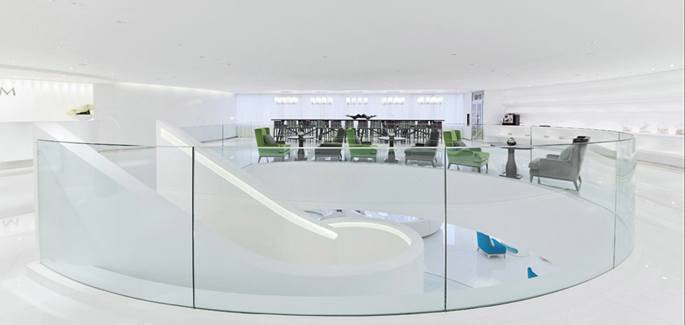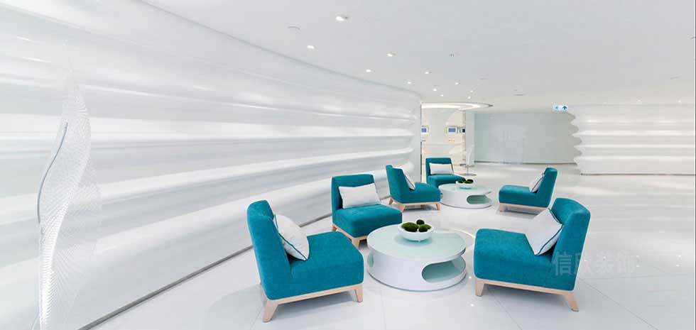 前臺的設計,采用和大廳一體的純白色設計,弧形形的前臺和頂面一體,看起來統一性和連貫性強,用最簡單的設計方式給人一種純潔干凈,不帶一絲人間煙火之氣的優雅質感,仿佛走進童話世界。