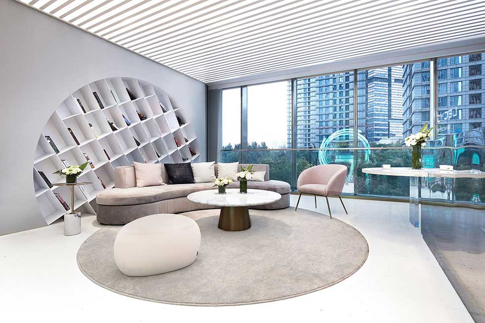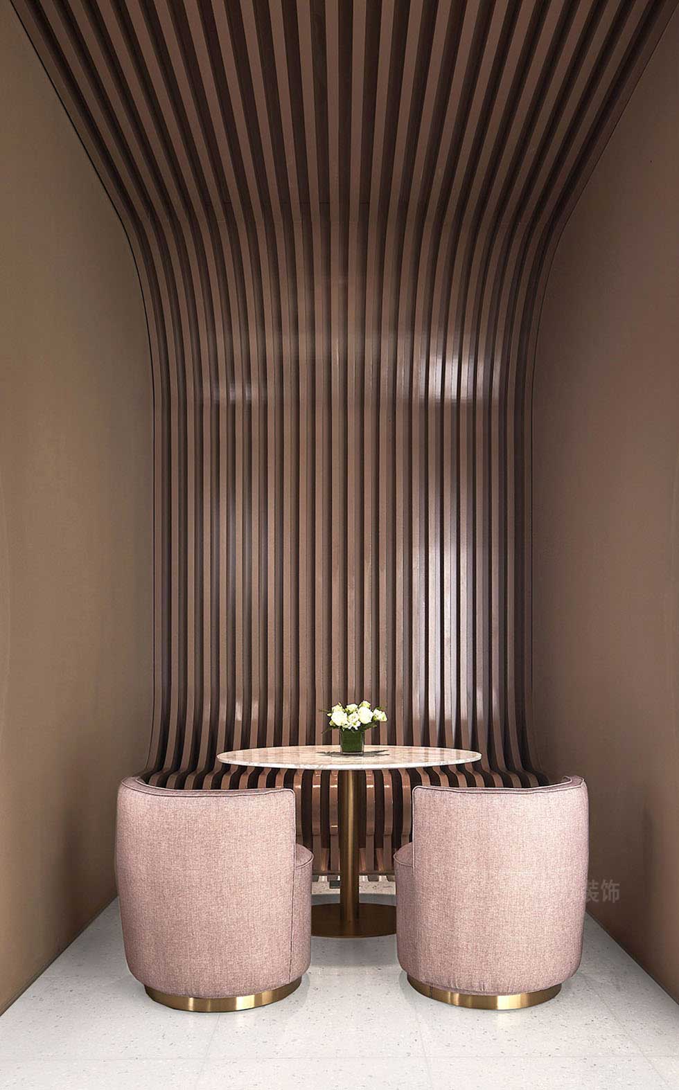 入口門洞的兩側(cè),則為一對一的咨詢區(qū),通過流暢的線條將兩個空間相連接,體現(xiàn)一種柔美的張力。如搖滾音樂與爵士樂碰撞出了火花,在喧鬧的朋克之下,有著唯美之感。