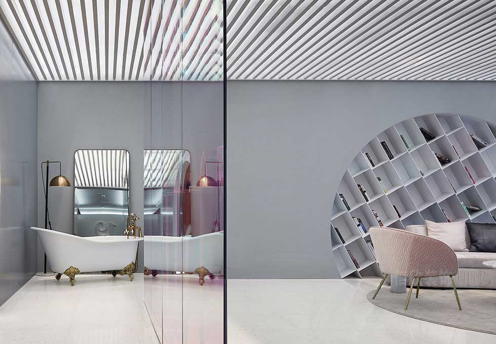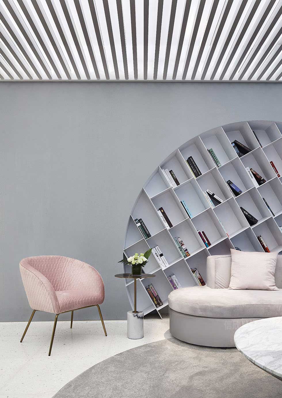 隧道盡頭的幻彩玻璃,折射出曼妙的光影。隨著光影進入純凈的大廳空間,白色的水磨石純粹而極致。沙發(fā)背后的拱形書架,延續(xù)弧線的設(shè)計元素,傾斜的造型,打破空間平衡,體現(xiàn)搖滾精神。美容包間內(nèi)則通過靜謐的燈光設(shè)計,營造安靜柔美的空間氛圍,給予內(nèi)心一份平靜,一刻的冥想,去尋找最真實的自我!