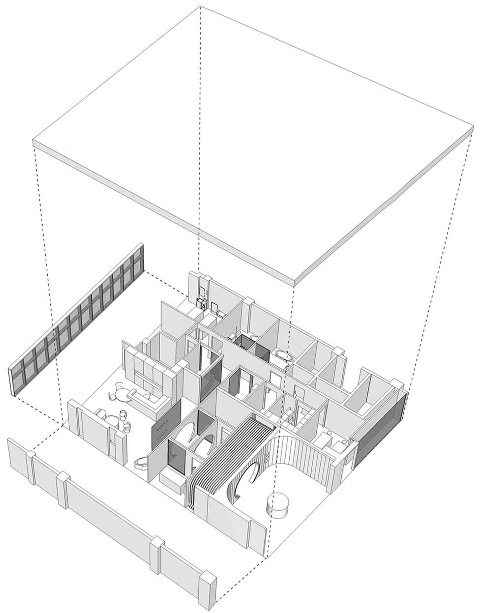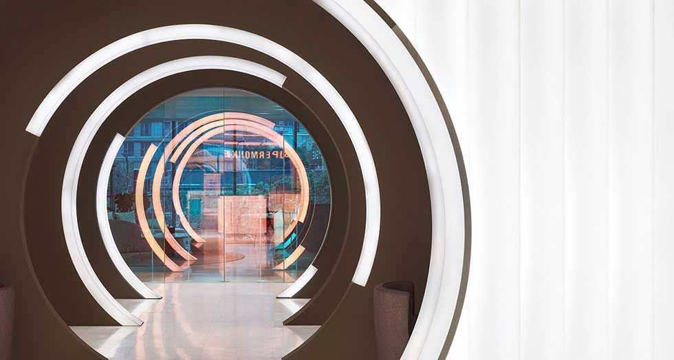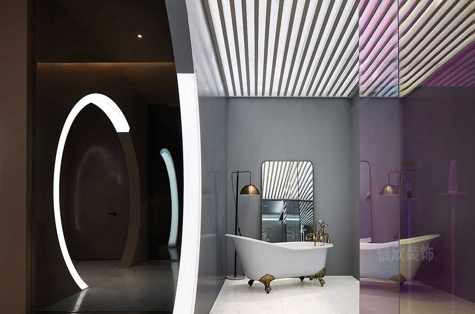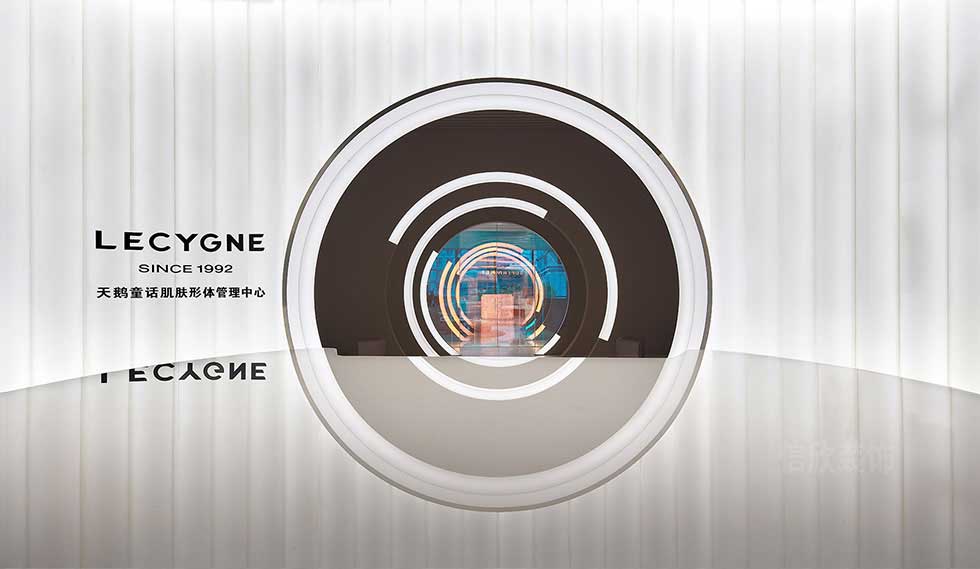 入口通過創(chuàng)造景深將視覺導入到空間,入口產(chǎn)品展示大廳,大面積白色與弧形門洞相疊加,穿梭進入旋轉(zhuǎn)光圈的弧形門洞,仿佛物質(zhì)經(jīng)過時間和空間的流轉(zhuǎn)而產(chǎn)生內(nèi)在變化,猶如置身于一條通往美與蛻變的“時光隧道”, 留給人無限的想象與神秘感。空間以近乎純白色調(diào)擴容視覺,通過光影、材料、線條的相互關(guān)聯(lián),體現(xiàn)多樣變化,同時將優(yōu)雅和專業(yè)的雙重屬性賦予LE CYGNE。