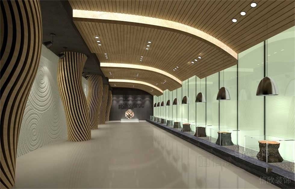 木文化長廊裝修設計,原木風格的格柵頂,砂巖的墻面,螺旋形狀的柱子等元素,讓通透式 的長廊顯得藝術感強烈,美感十足,現代玻璃的展區襯托的惟妙惟肖。