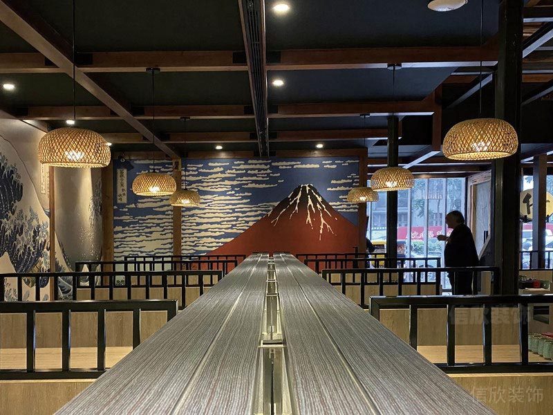 本壽司店一眼看上去給人的感覺(jué),明亮開(kāi)闊,木藝的量和長(zhǎng)條原木桌的配合,空間延伸感很好,四周浮世繪海浪的壁紙,濃厚的日式風(fēng)情,而藤編的手工吊燈,為海浪的蒼涼,平舔了幾分溫馨。