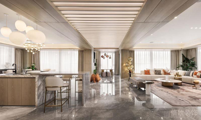 步入入戶,真個灰色系構成的地面,原木格柵頂的造型,明亮寬敞的大廳,讓人感覺奢華和貴氣撲面而來。