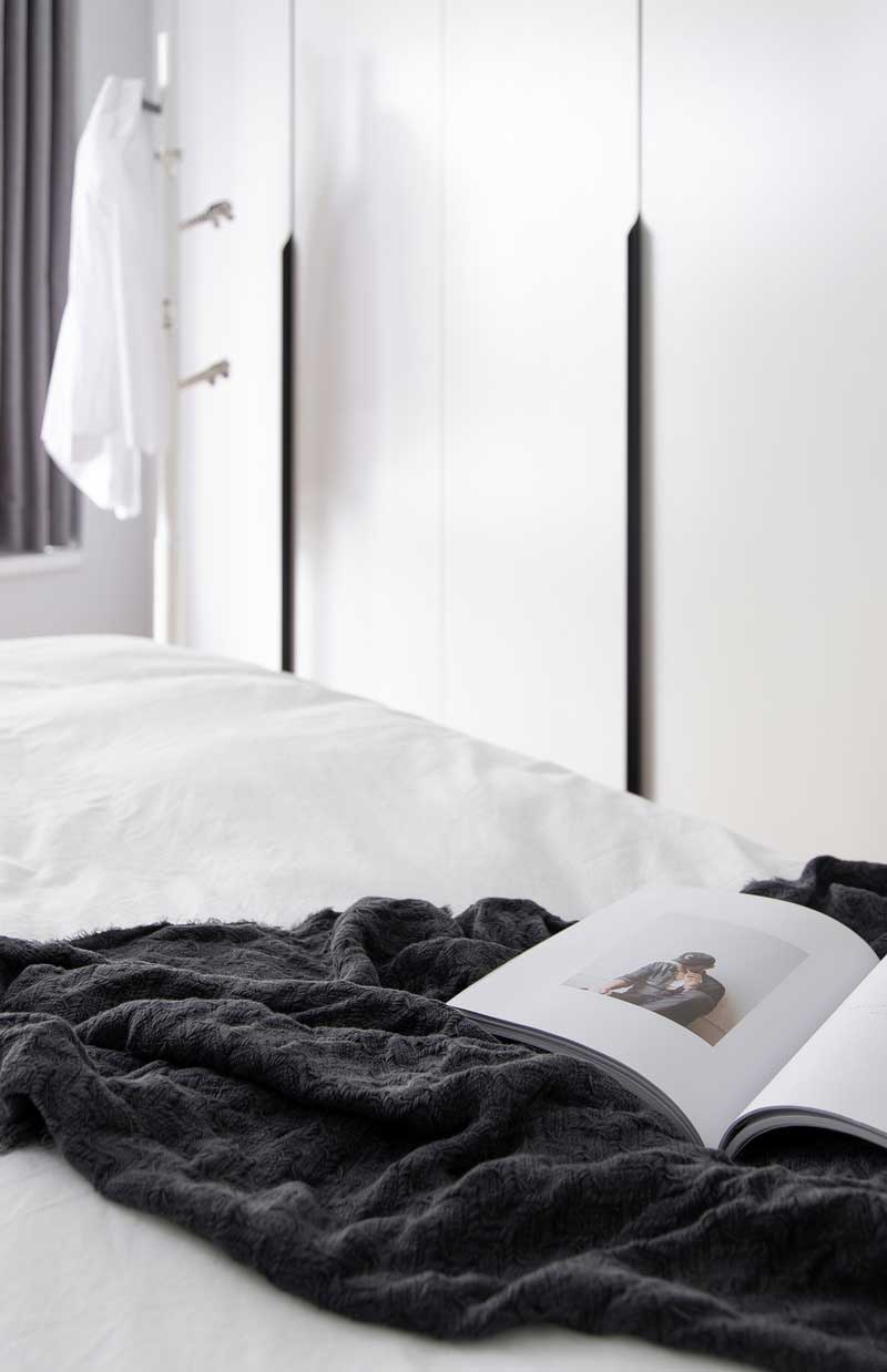 主臥的裝修風(fēng)格,以極簡的無頂式無背景墻的風(fēng)格為主,考慮到衣服比較多,整面墻作為衣柜的方式,以整體色調(diào)吻合的白色,飄窗則作為休閑和看風(fēng)景的區(qū)域,刻意的用人造石做了觀