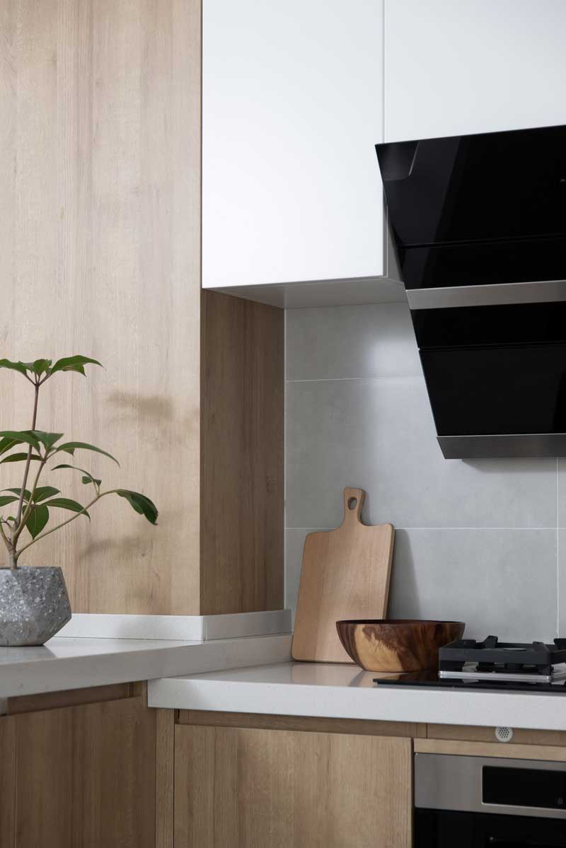 廚房采用開放式的設(shè)計(jì),這樣在整體上可以和客廳更連貫,沒有傳統(tǒng)的隔墻束縛。房間的面積更大,黑色的地磚和原木系的柜子,符合日式風(fēng)格的色彩搭配,白色和原木色系的插色,現(xiàn)代時(shí)尚,設(shè)計(jì)新穎。