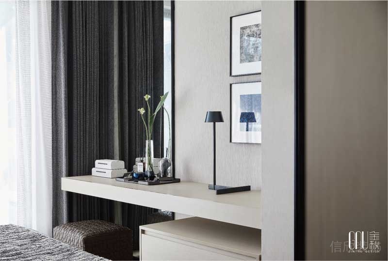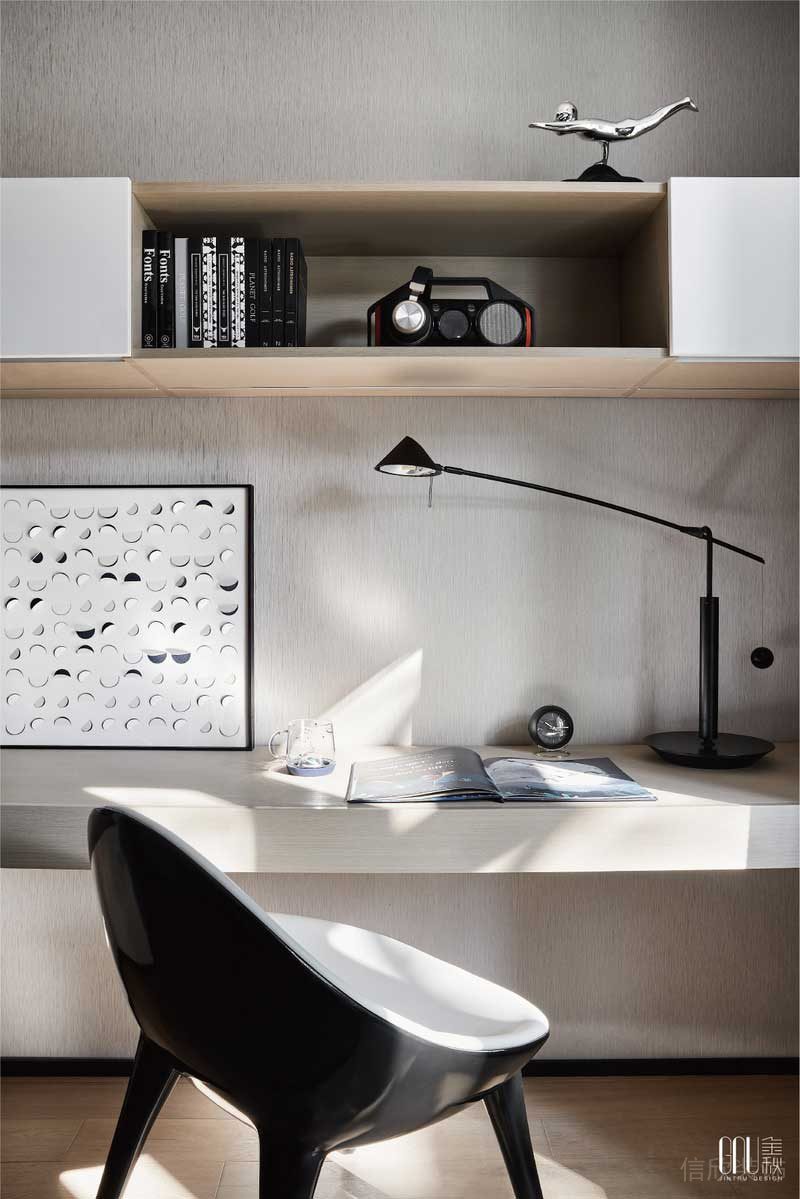 掛畫、地毯、沙發、均以延續性的線性提煉、創意性而簡約的視覺造型、純粹的現代主義美學及精尚的質感,是金秋設計一貫的設計語言。幾何重塑的形態,在空間中演繹著歲月風化的痕跡,賦予未來生活全新的視角。