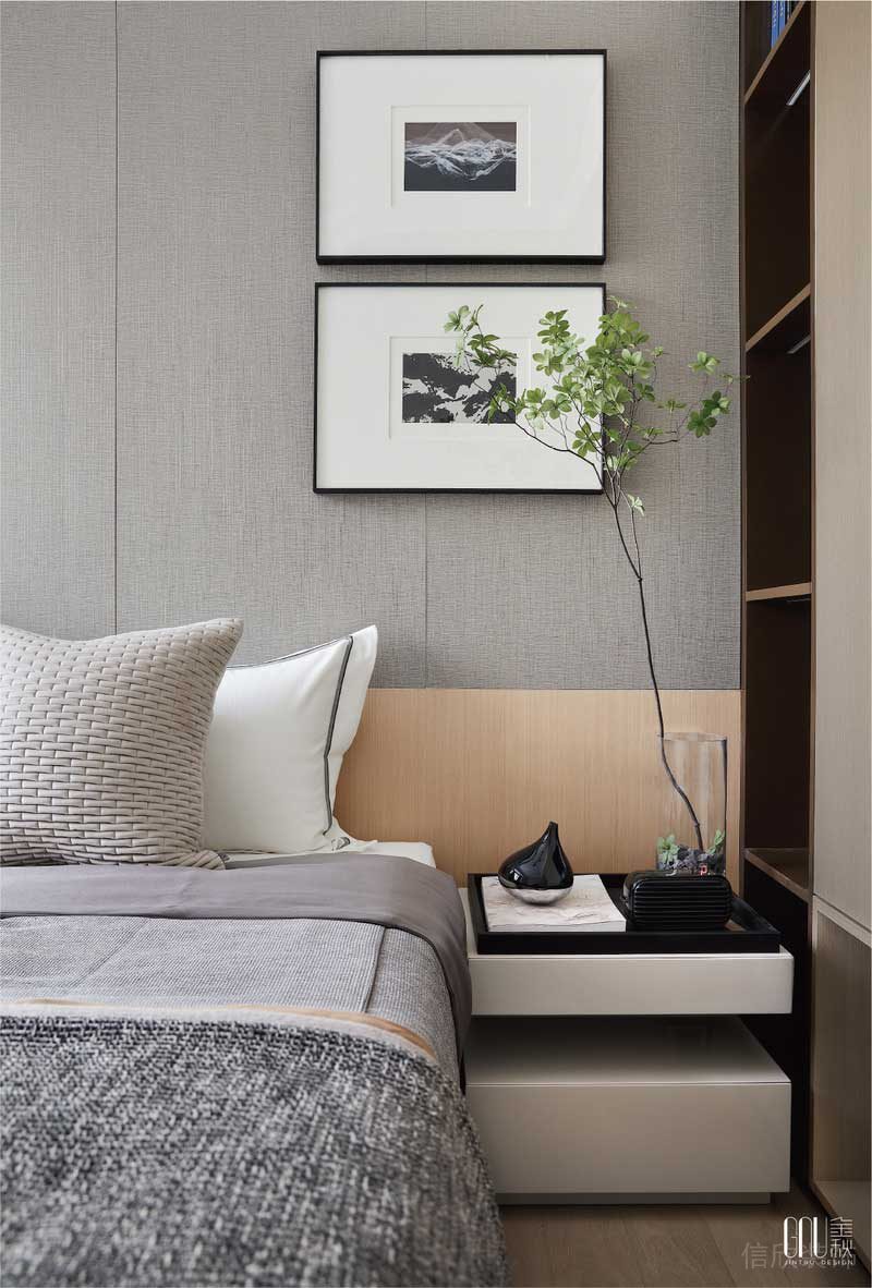 還原空間的本質,減少不必要的物件,純白的基調中卻潛藏著無限生機,光與水的主題掛畫是臥室起居的生活映射,弱對比色調賦予歸巢從容而安的感受。