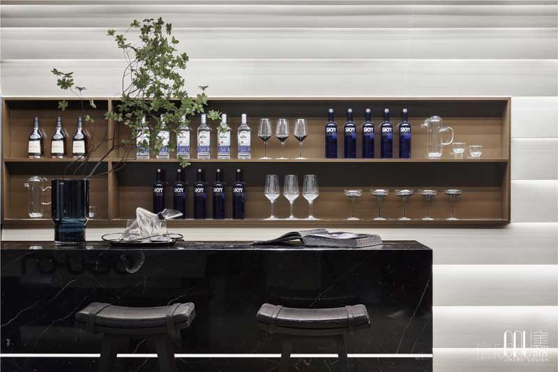 一整面墻體淺色系和深咖色結合的酒柜,在燈條的照射下,光影流動,奢華大氣,搭配黑色的高腳椅和吧臺,身處家中可身邊流轉的是不遜于高端會所的奢華體驗,放松和休閑享受。