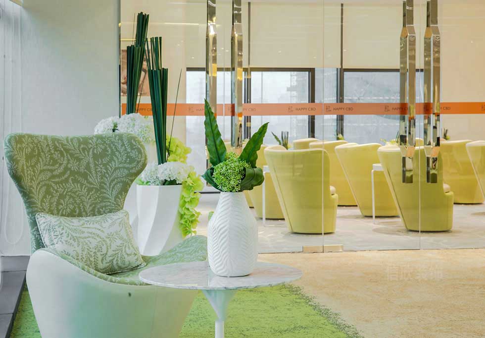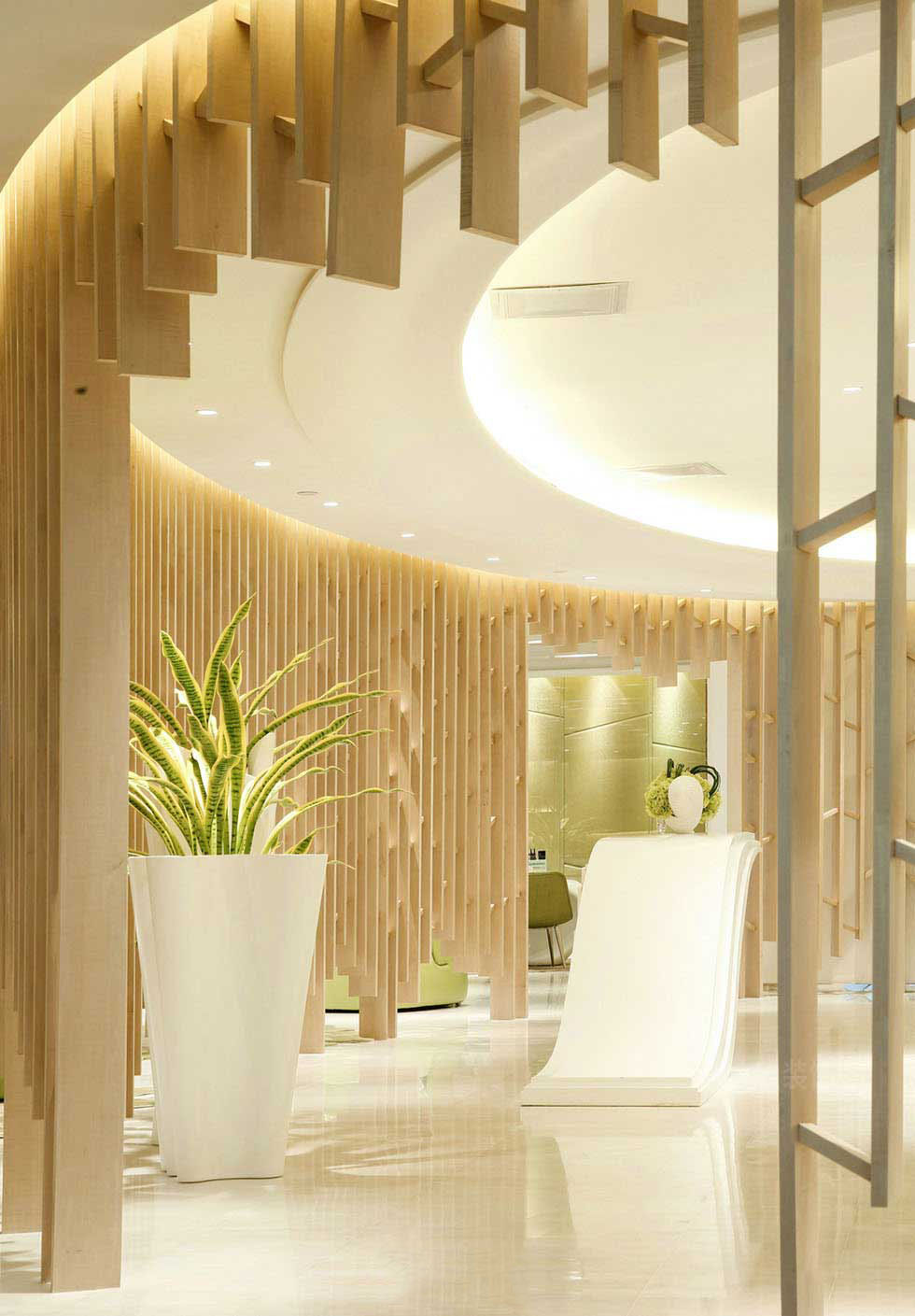 設(shè)計(jì)理念:隨著健康、原生態(tài)的概念越來越受城市人青睞,把原生態(tài)概念滲透到美容辦公的體驗(yàn)中心去。木條子高低錯(cuò)落,宛如樹的枝葉垂吊在天花上。即為空間分割,也是空間造型與設(shè)計(jì)初衷的融合。搭配了嫩綠色的家具及植物紋理的地毯,使整個(gè)空間貫穿協(xié)調(diào)統(tǒng)一。