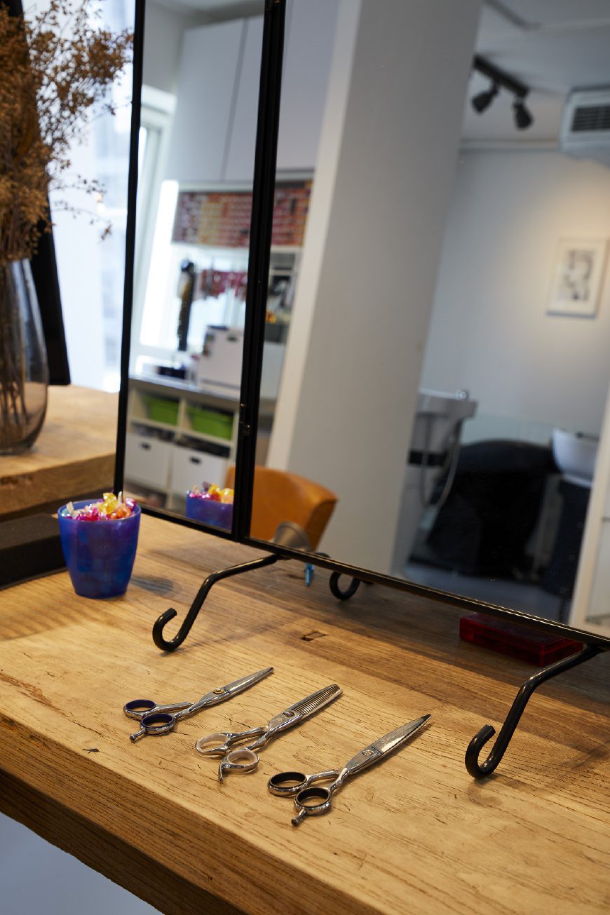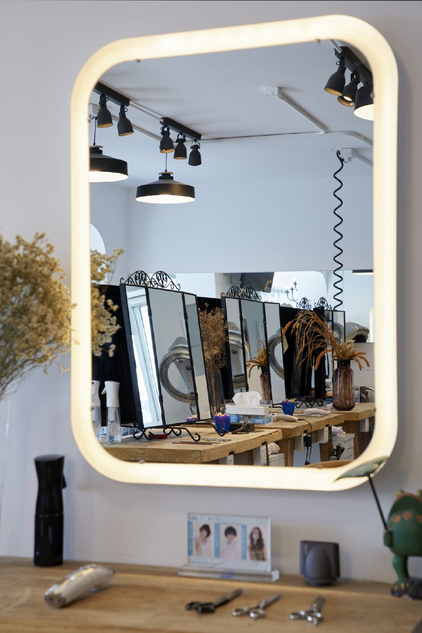 大廳的裝修設計以白色和灰色為主,本著簡潔實用的理念,原木風的桌椅,造型區和大廳不做多余的功能分區,簡單的發型鏡和操作臺,簡潔干練中,給人一種畫室的藝術氣氛。