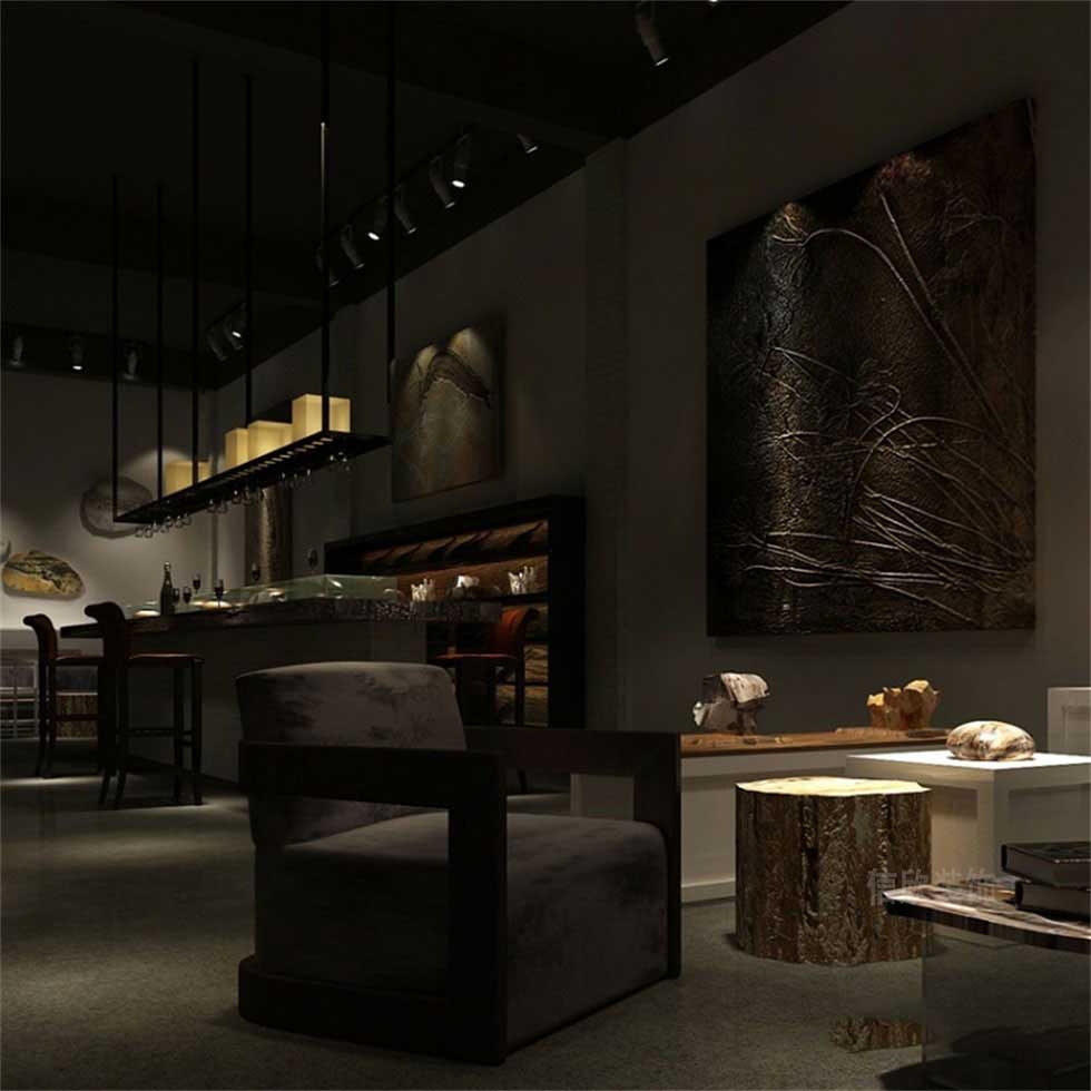 黑色的酒柜和白色的展柜以及家具,做了一個顏色的對撞,黑白的經典百搭色形成了鮮明的對比,在昏暗的環境氣氛烘托下,灰色的微光更能讓展品本身的美感脫穎而出,令人沉醉。