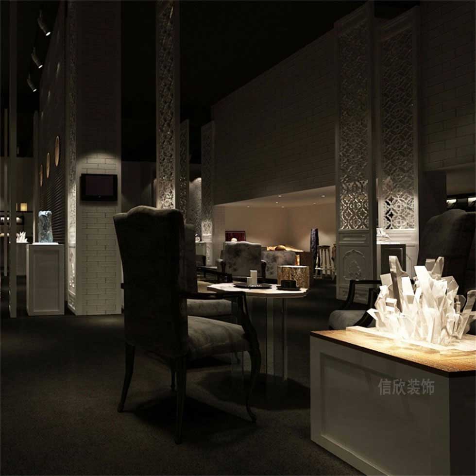 寶石展館的裝修設計,為了在昏暗的光線下襯托出寶石最天然最直觀的美感,采用灰白兩種自然色調為主體,灰色的地毯,白色的文化石墻面和雕花式的鏤空格調,提煉出一種神秘深邃的氣質,一種冷色調的典雅韻味。