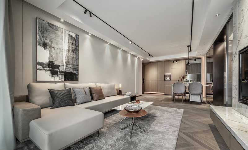 深圳龍華新區家庭新房裝修,位于龍華萬科和風軒,面積120平方米。開闊的客餐廳會讓餐桌文化更加充滿熱情, 大理石為灰白色的空間增加了一絲冷靜睿智的氣息, 燈光暖化了整個空間。 是直線或是點碰面又或相互交錯, 給整個空間和布局增加了氣氛, 讓人們在空間內的用餐交談更加舒適自在。