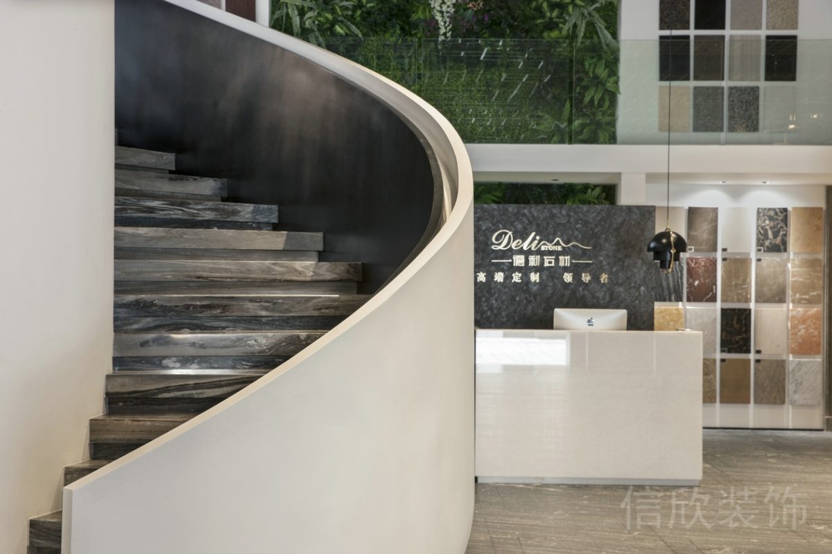 旅游辦公室黑色前臺,大理石紋路地面,背景白色乳膠漆與大理石材質相結合,頂面黑色弧度吊頂,臺面采用啞光磨砂材質。
