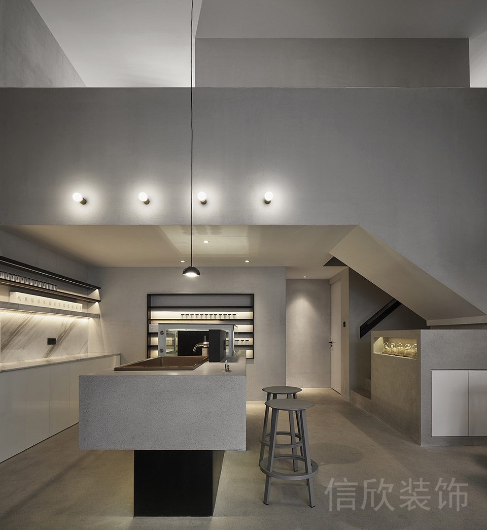過道藝術感強烈,極簡的色彩搭配出高級質感,黑白墻面,吊頂與墻面弧度造型連接到一起,柔和空間感,地面白色烤漆,頂面筒燈與墻面壁燈相結合,藝術品的擺放更突出了空間時尚簡約氛圍。