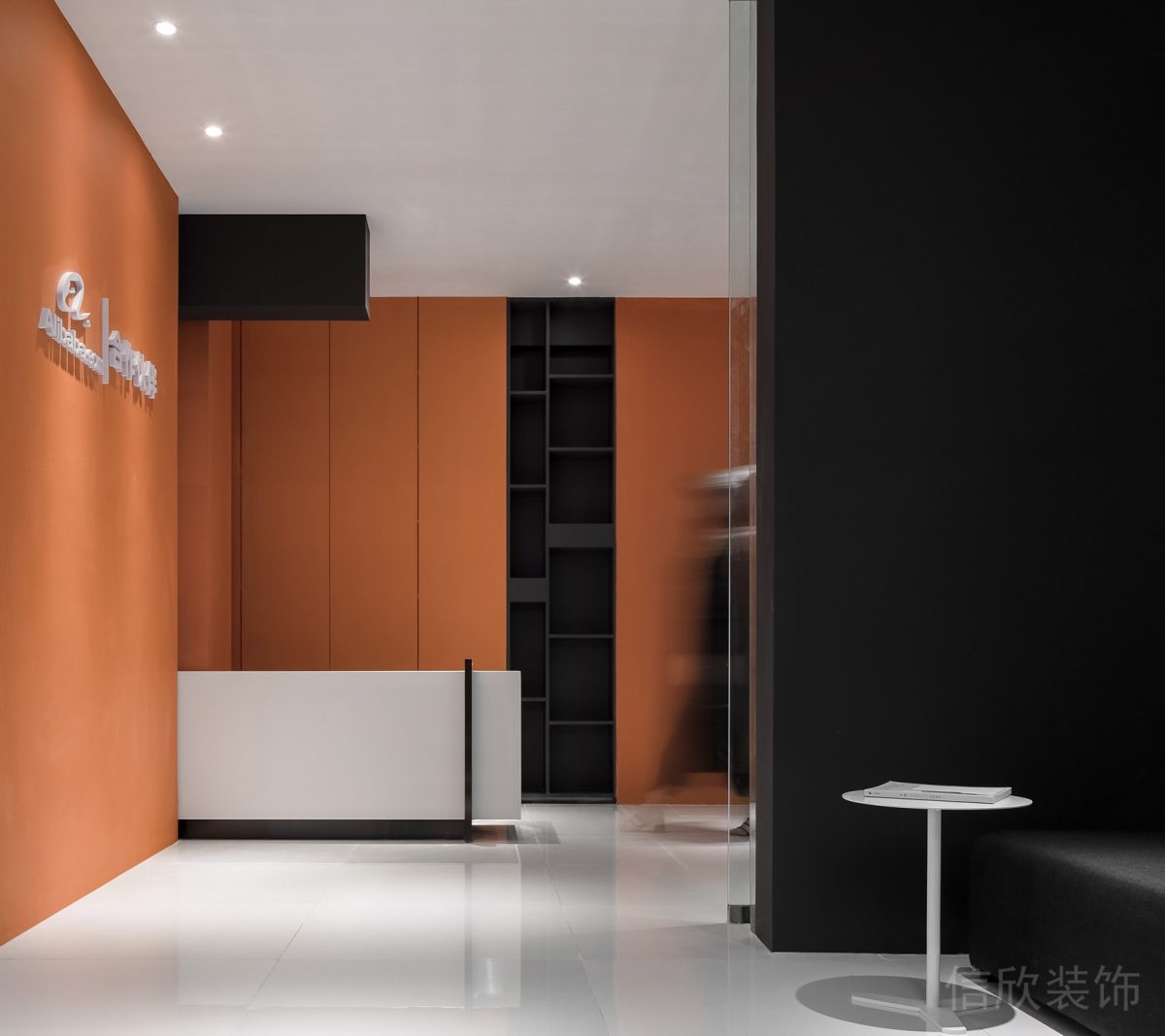 深圳騰飛旅游辦公室裝修設計采用了以黑白為主色調的現代簡約風,大面積的黑白低調沉穩,極簡的色彩與設計感極強的吊頂搭配,高端大氣。