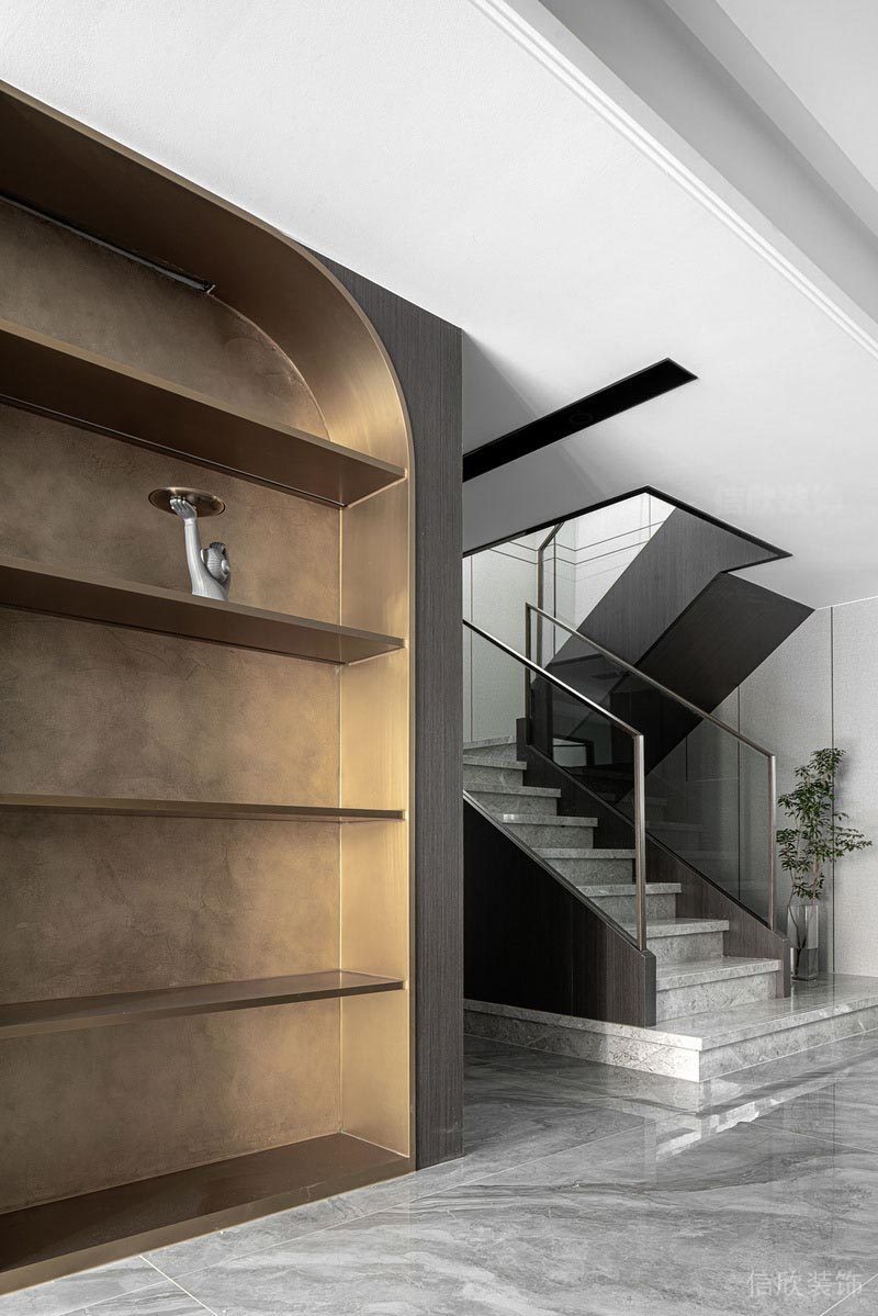 深圳市寶安區石巖匯邦·名都花園樓梯背景墻柜 圓弧式的不規則幾何排列柜子,設計感強,色彩飽滿。