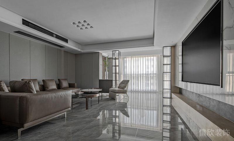 深圳市寶安區石巖匯邦·名都花園沙發背景墻 灰咖兩色的單一背景墻,冷色調的飽滿色感,現代皮質沙發,潮流感十足。