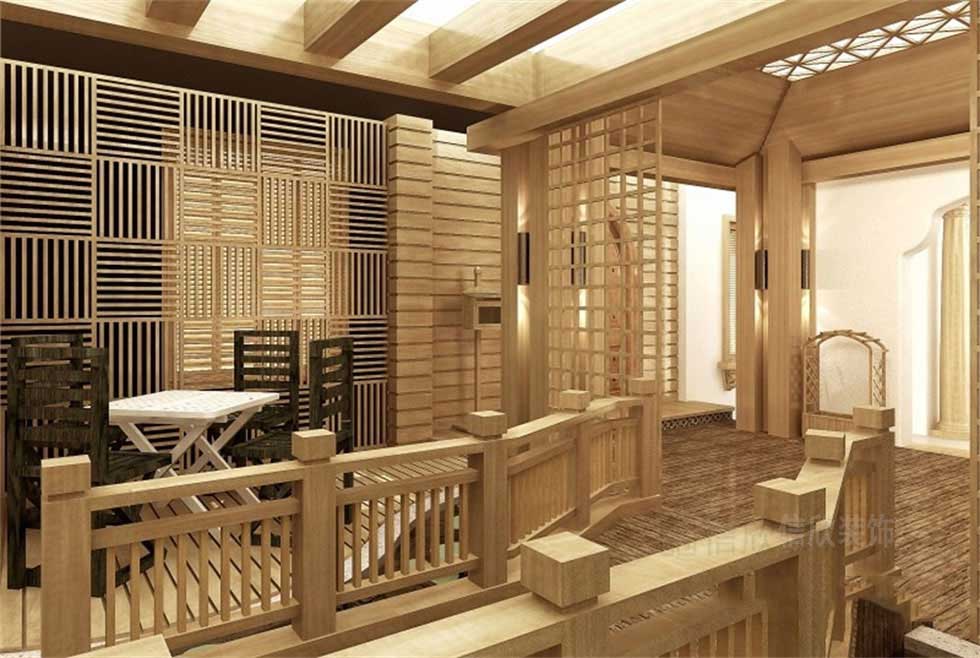 木易結構的亭子,在室內塑造出小橋流水的感覺,竹子寓意曲徑通幽處的禪趣,荷花池的設計,給原木風注入一絲綠意,更有生機勃勃的感覺,讓整個空間充滿了生氣。