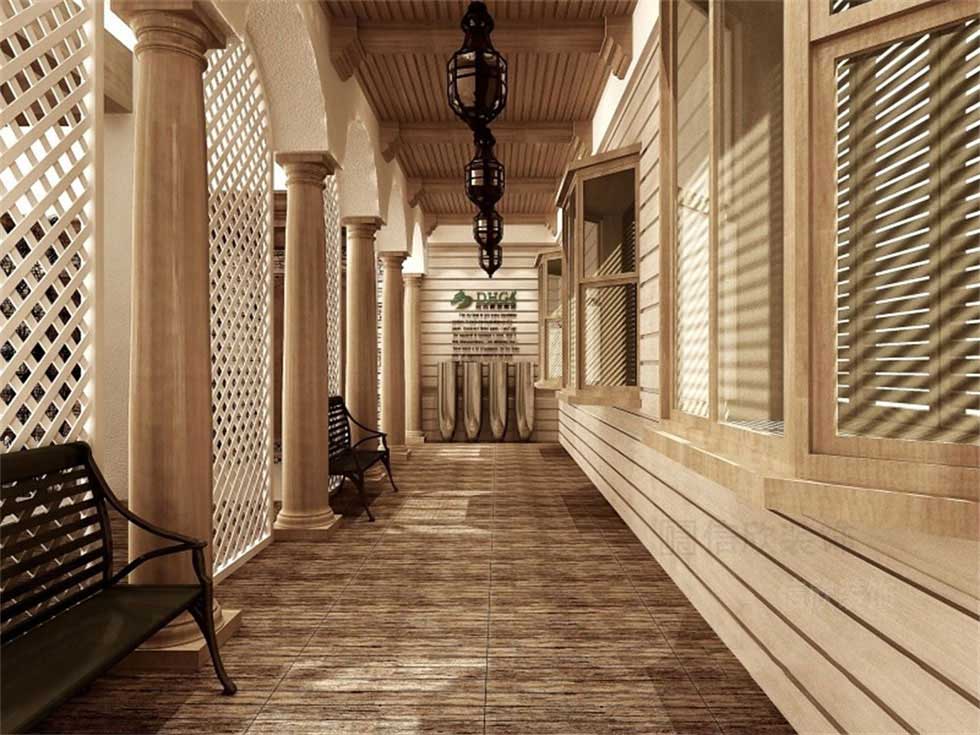 展廳入門的設計理念,以淺黃色的單色調為主,為了凸顯原木風展廳的自然感,用顏色相近的表現形式,加入歐式羅馬柱,拱形門等元素,襯托出大氣和自然的感覺。